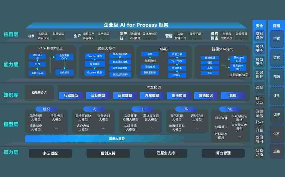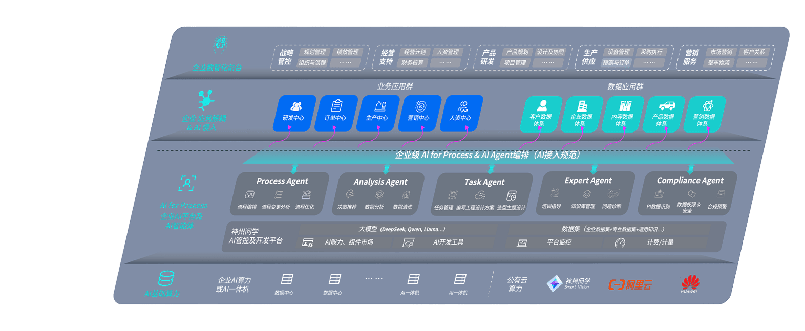 端到端的一站式AI工作空间深度融合了从企业战略规划到日常经营的全流程业务板块,,定向解决车企内部领域多、、、、部门多、、、、链条长、、、、场景碎片化等难题,,,,支持车企快速构建以AI为核心的生产力写作体系,,,,实现任务执行与AI能力的无缝集成与交互